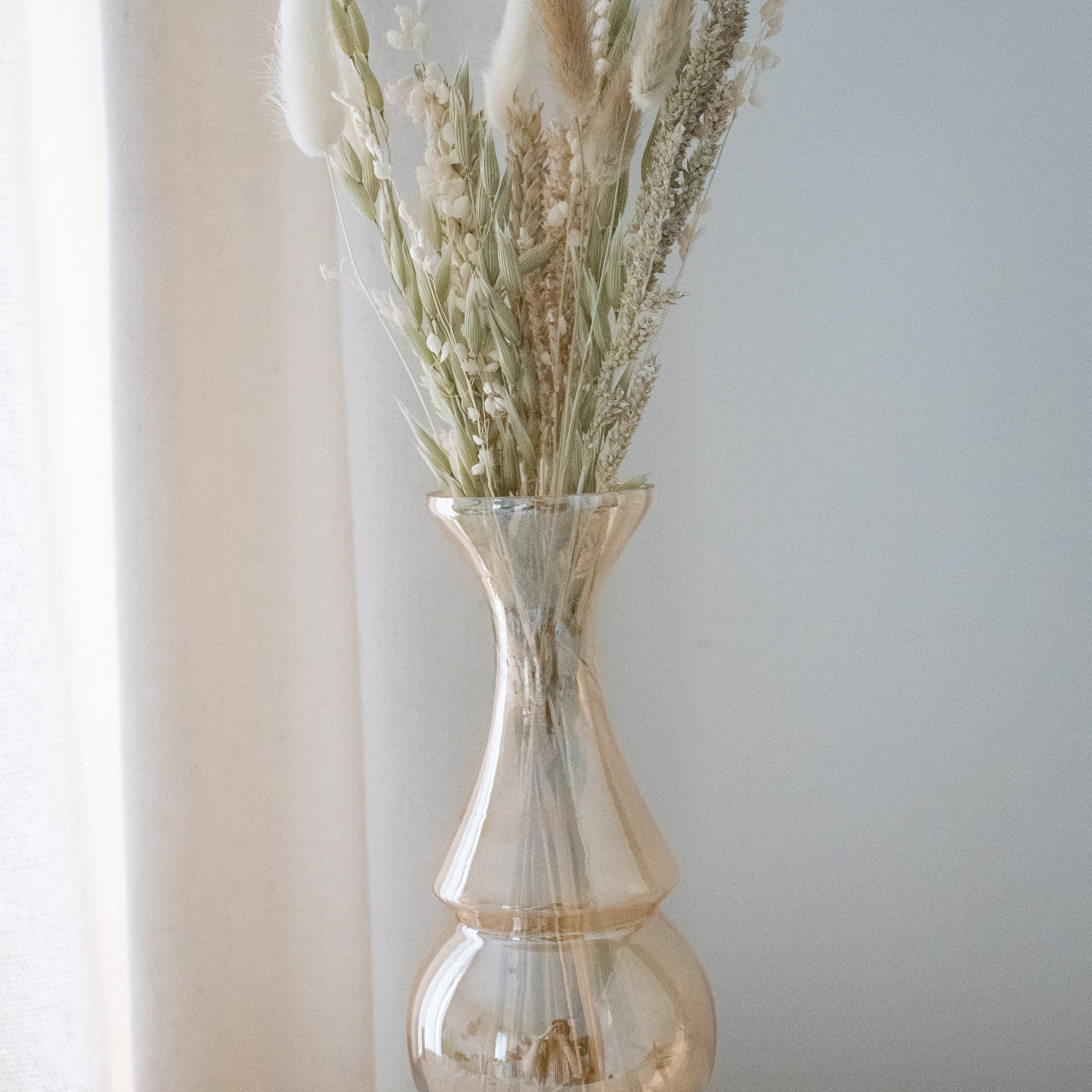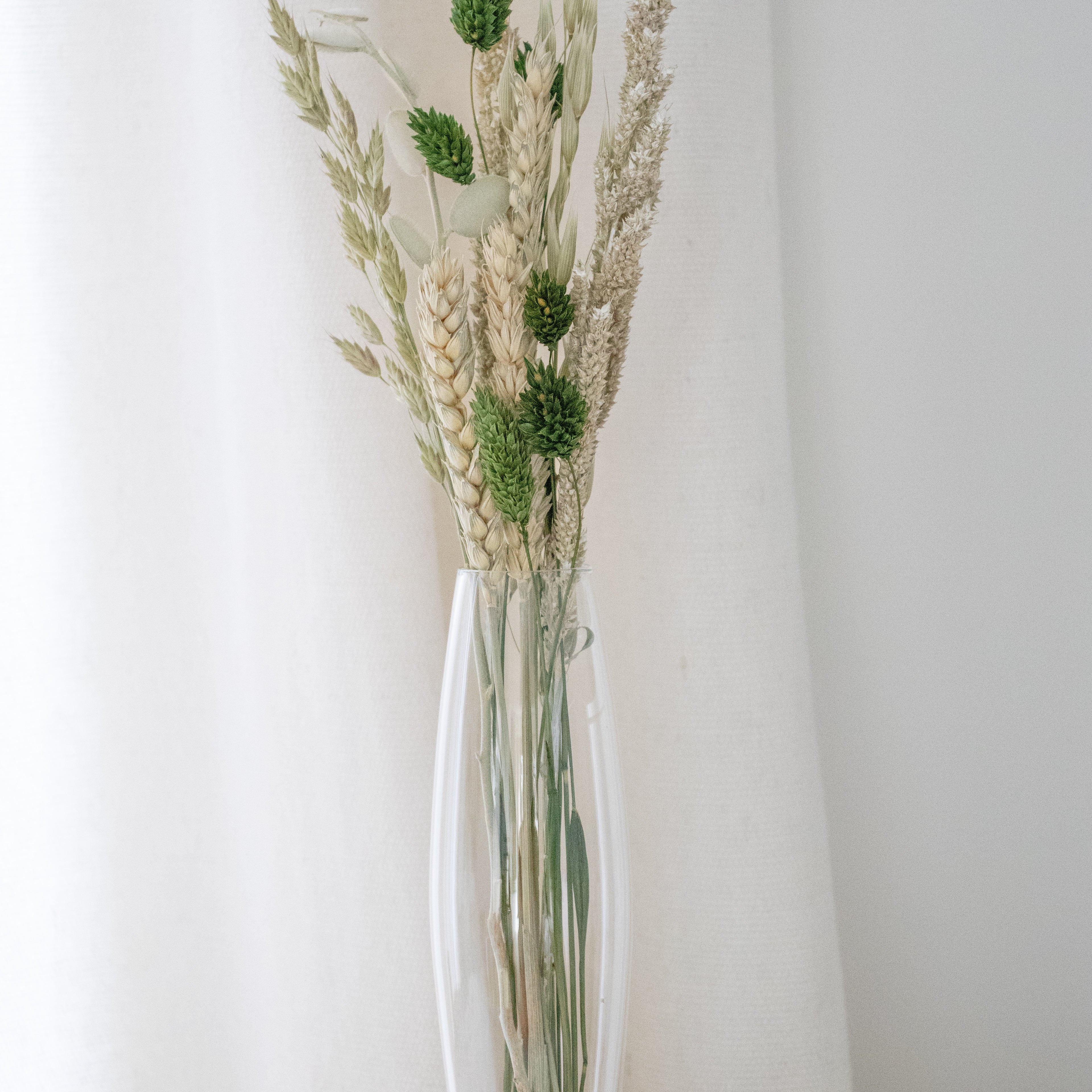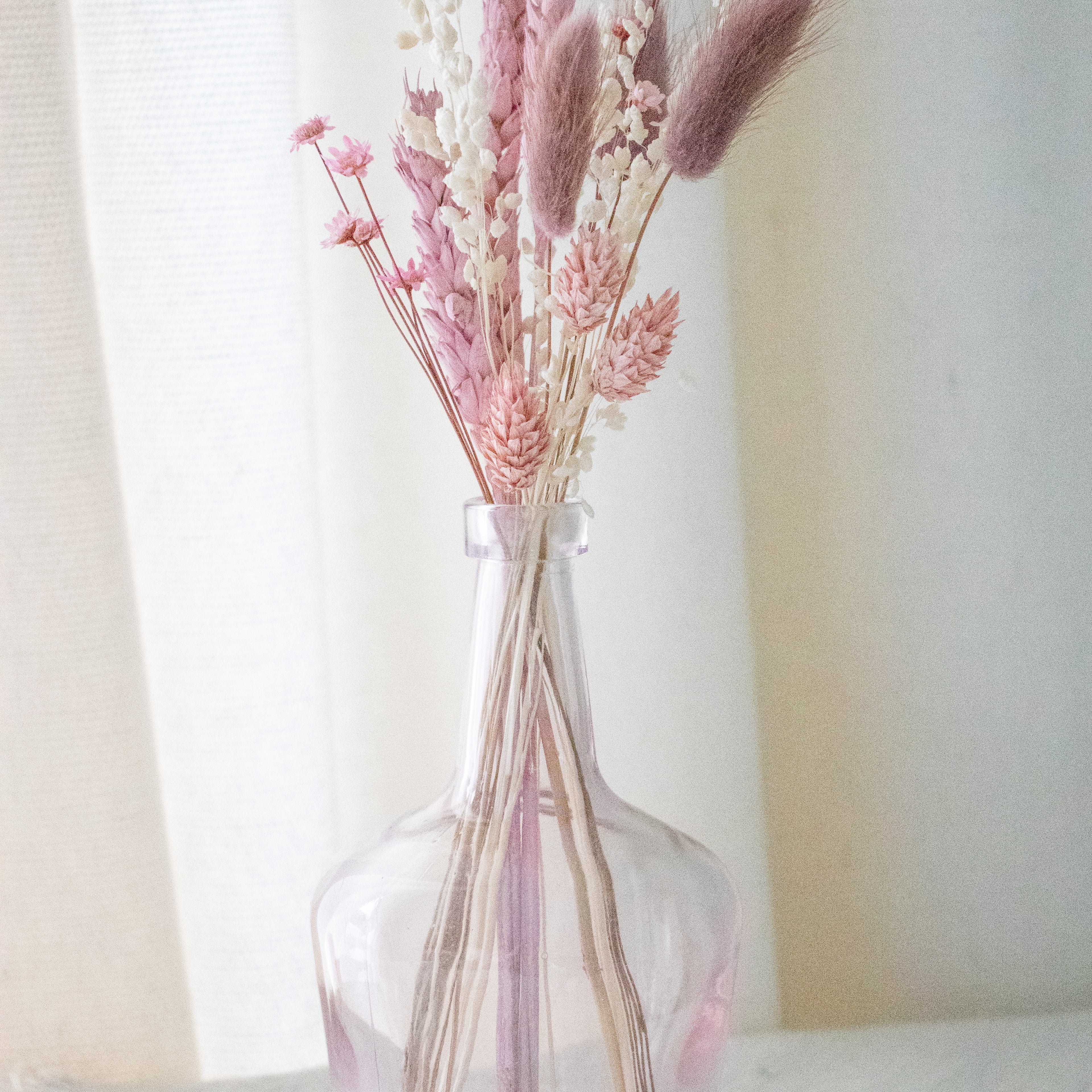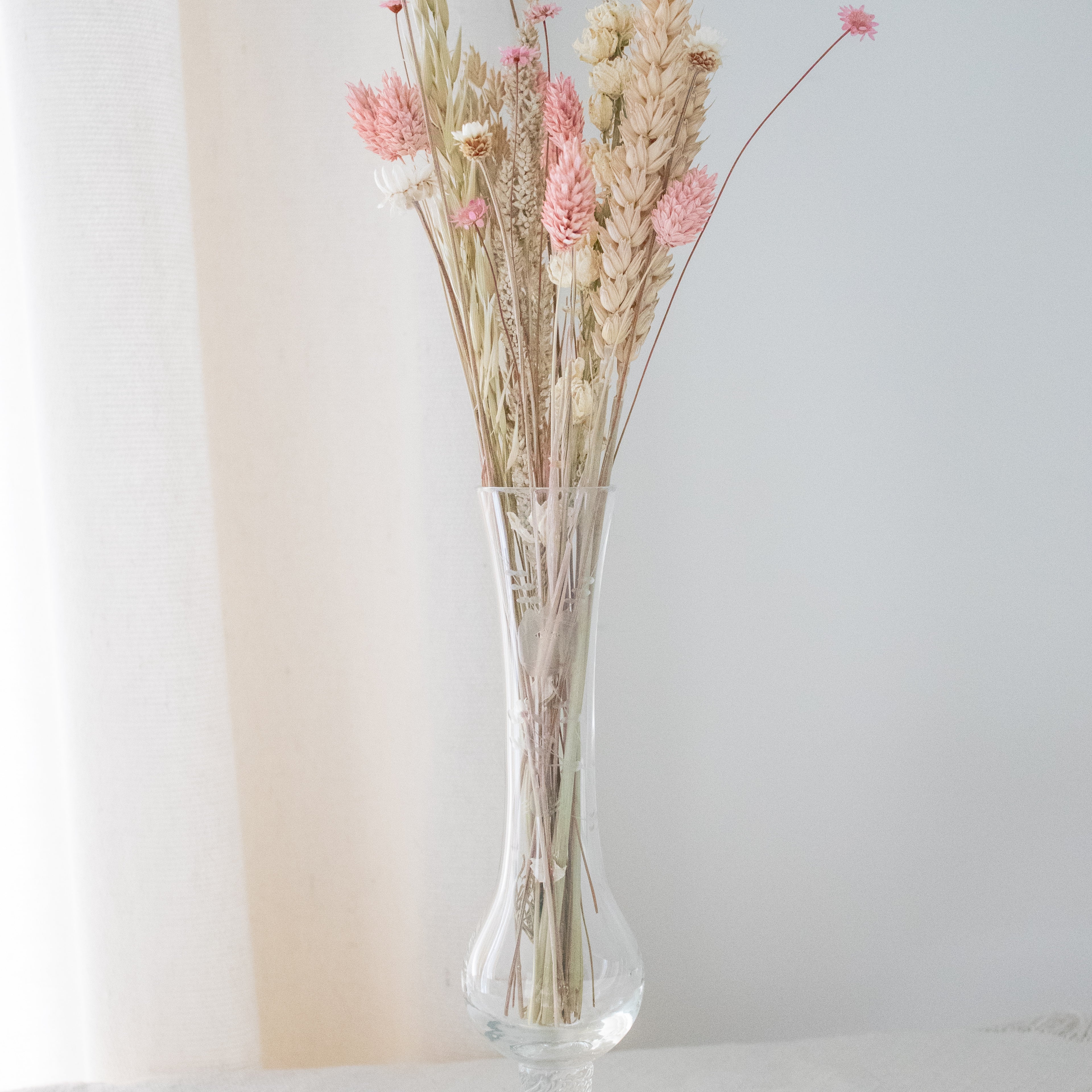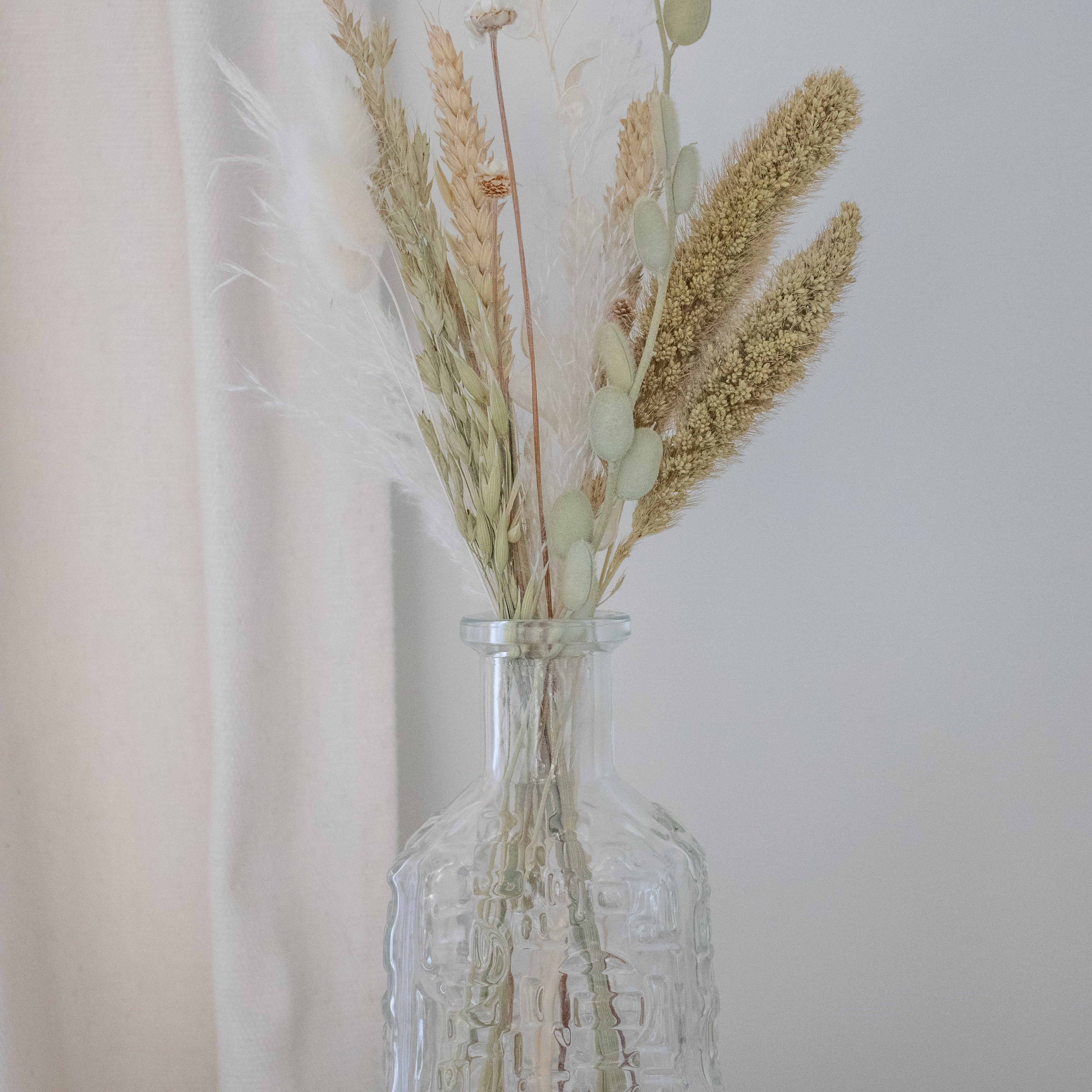Kringloopgelukje – Transparant glazen vaasje met droogbloemenmix