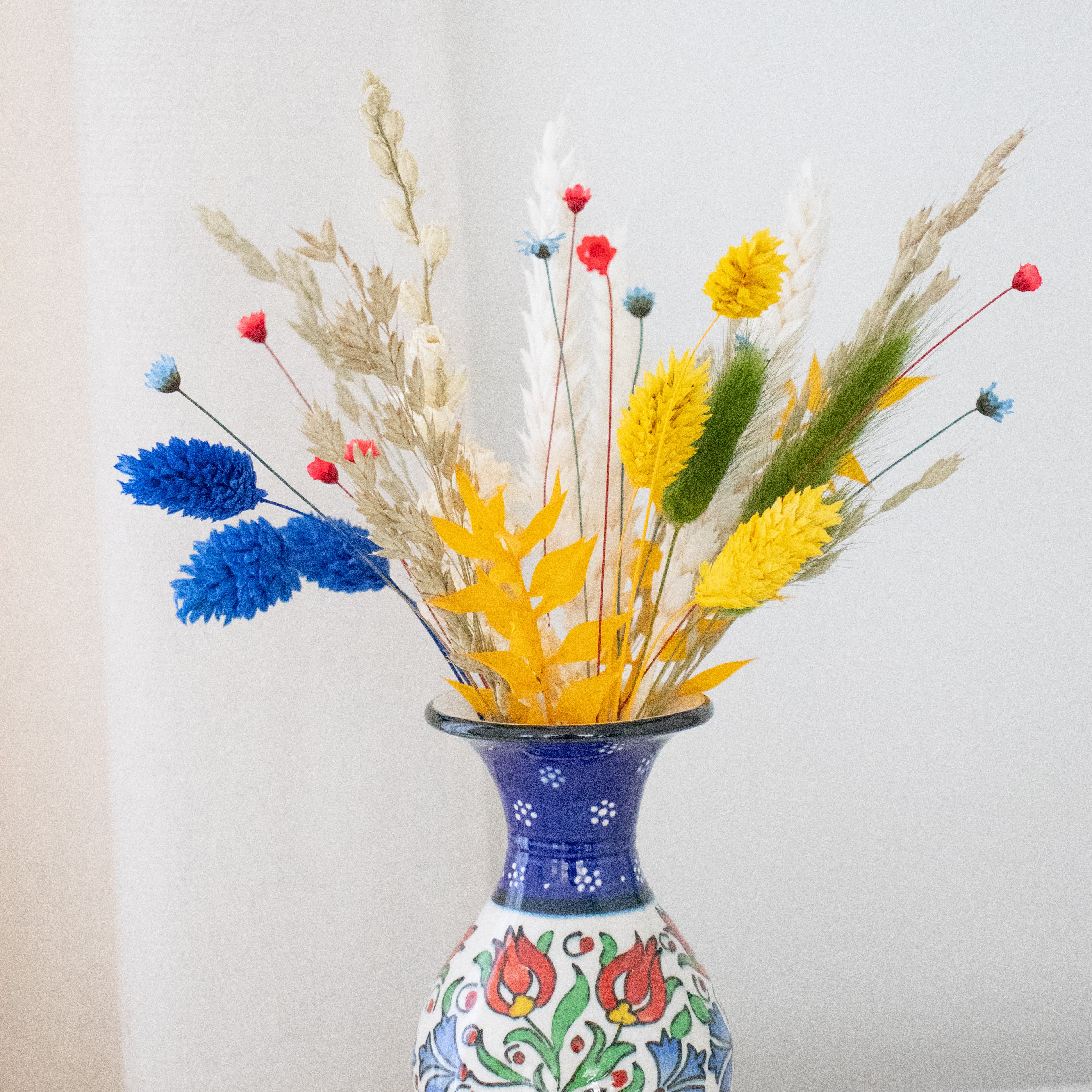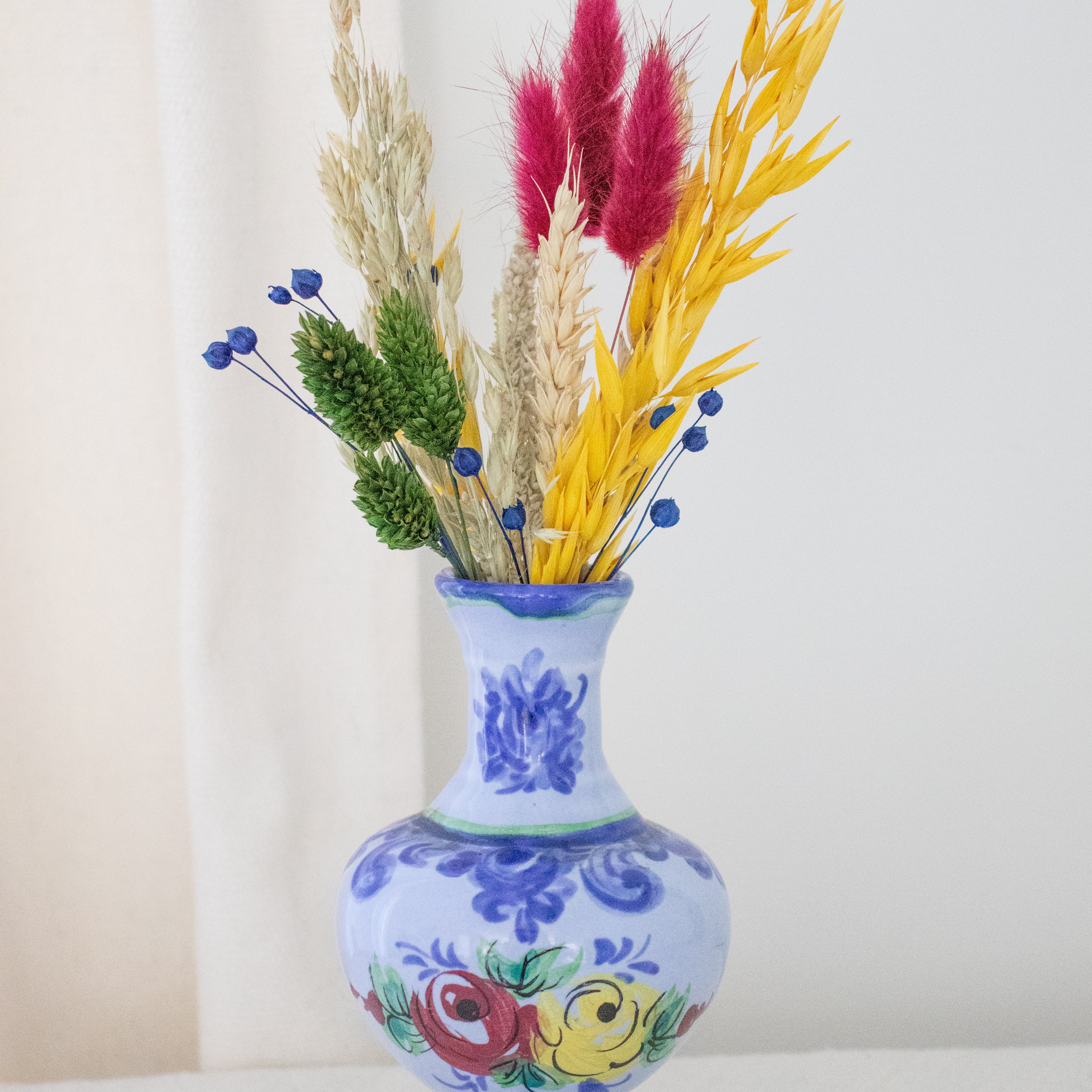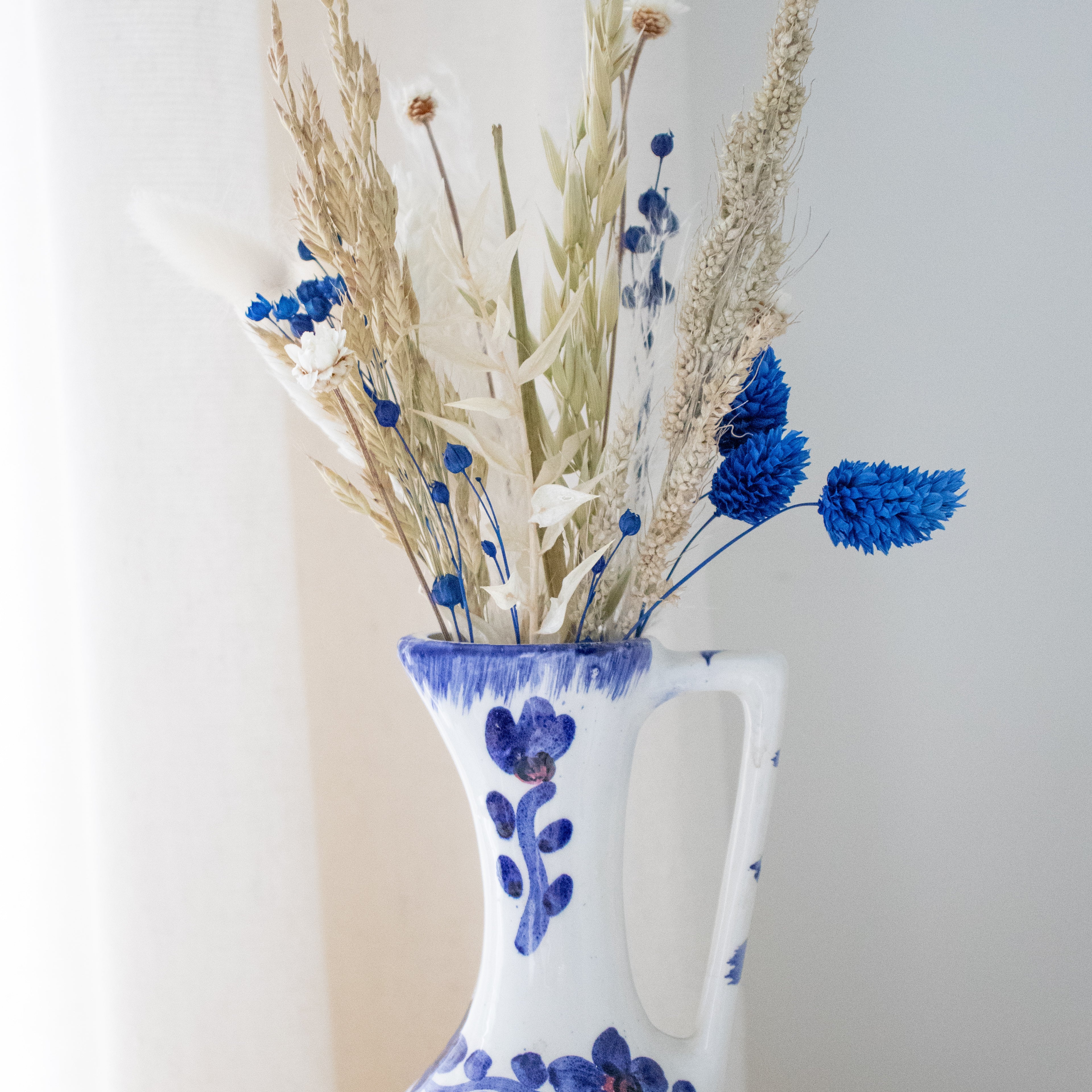 Deze blauwe vaas met Oosters bloemenpatroon is al een kunstwerk op zich, maar met het kleurrijke droogbloemenboeket erin wordt het helemaal een feestje. Geel, rood, blauw, groen… kortom: instant vrolijkheid in huis.
