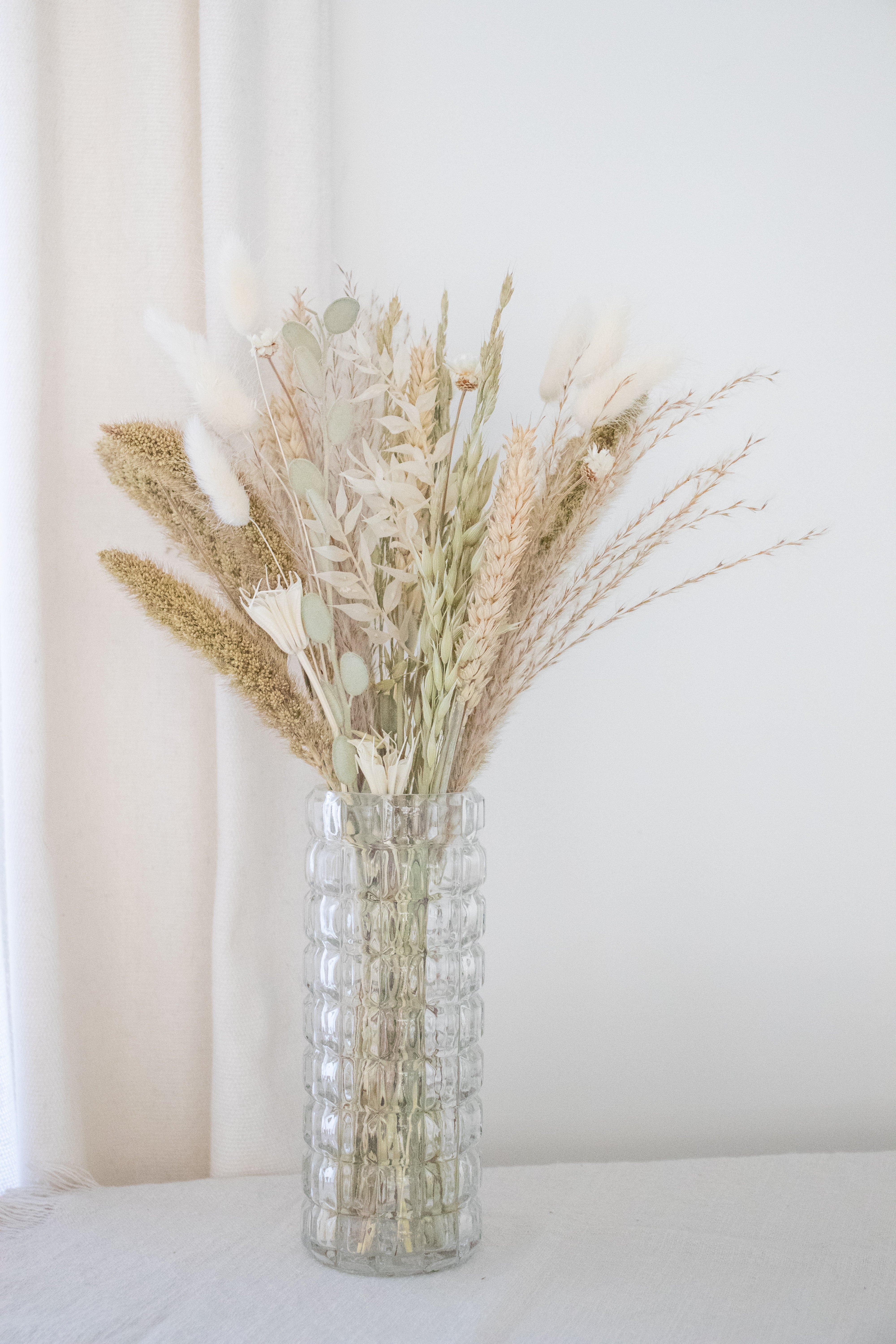 Transparant glazen vaasje met droogbloemenmix