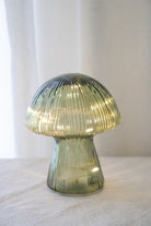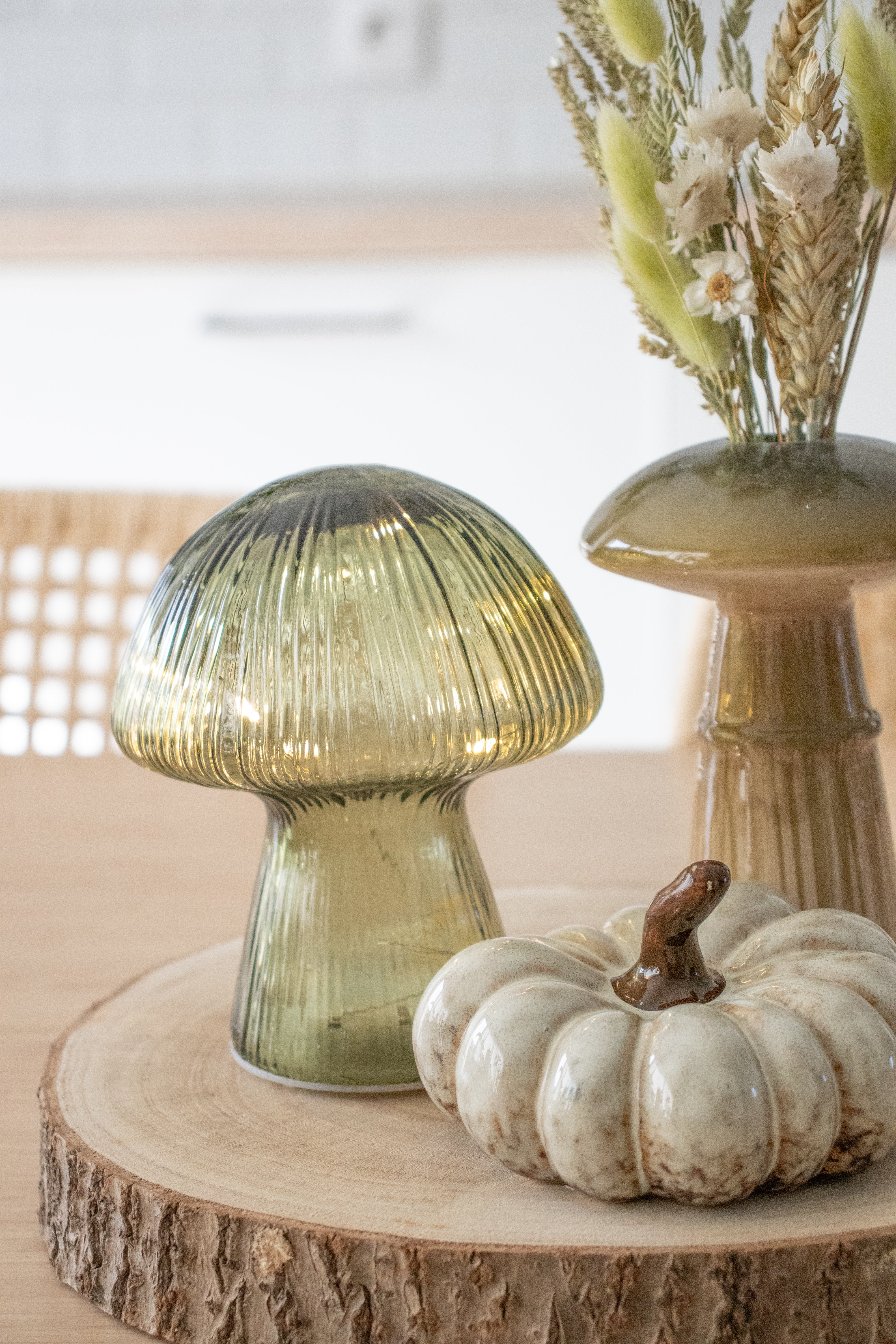Deze paddenstoel lamp van geribbeld groen glas geeft een warme, sfeervolle gloed zodra je de lichtjes aanzet. Perfect voor donkere herfst- en winteravonden of gewoon om een knus hoekje extra gezellig te maken.