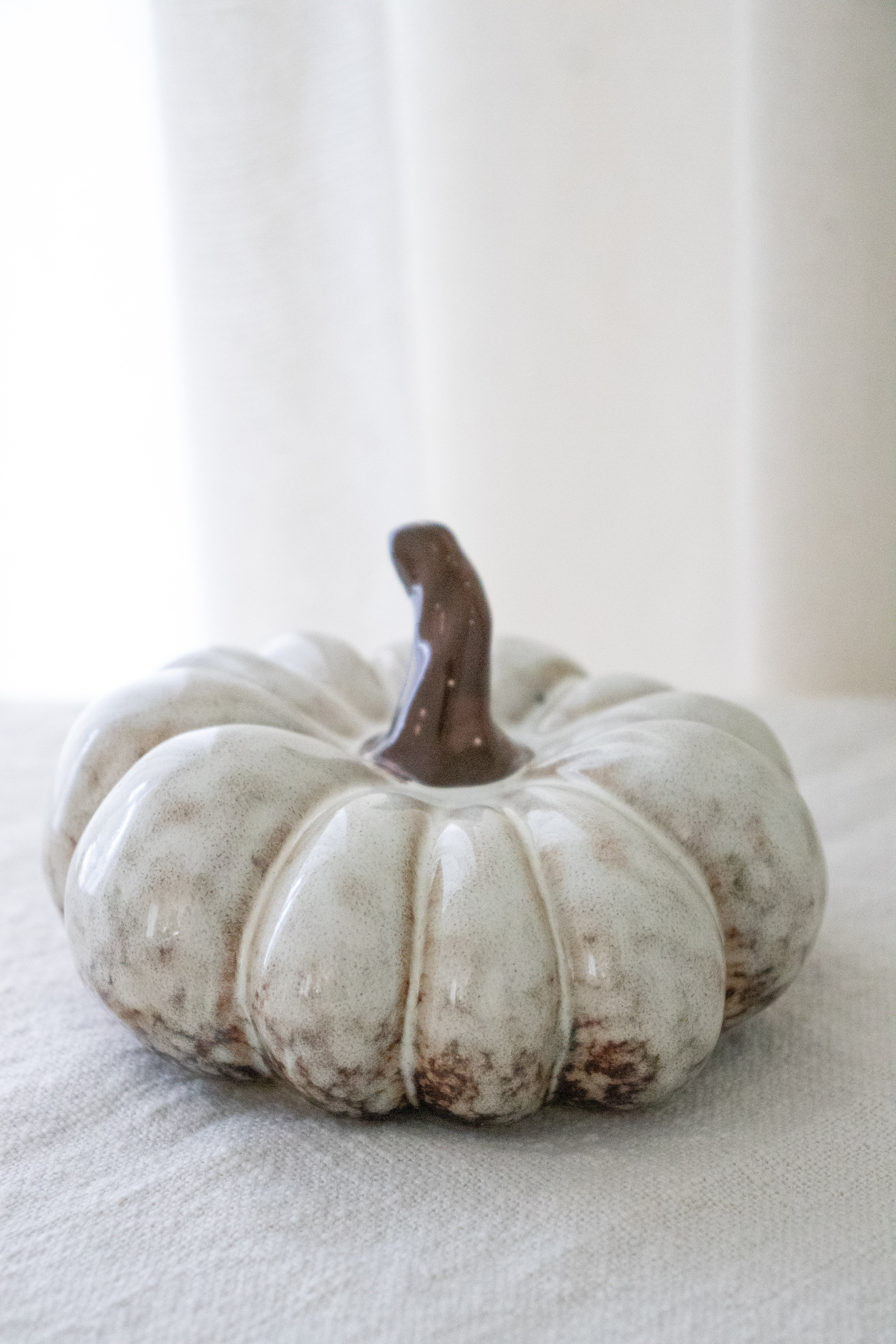 Een subtiele maar sfeervolle toevoeging aan je herfstdecoratie 🎃 Deze lage keramieken pompoen in wit met bruine details en een glanzend steeltje brengt warmte in elk interieur. Combineer hem met kaarslicht, droogbloemen of andere pompoenen voor een gezellig geheel.