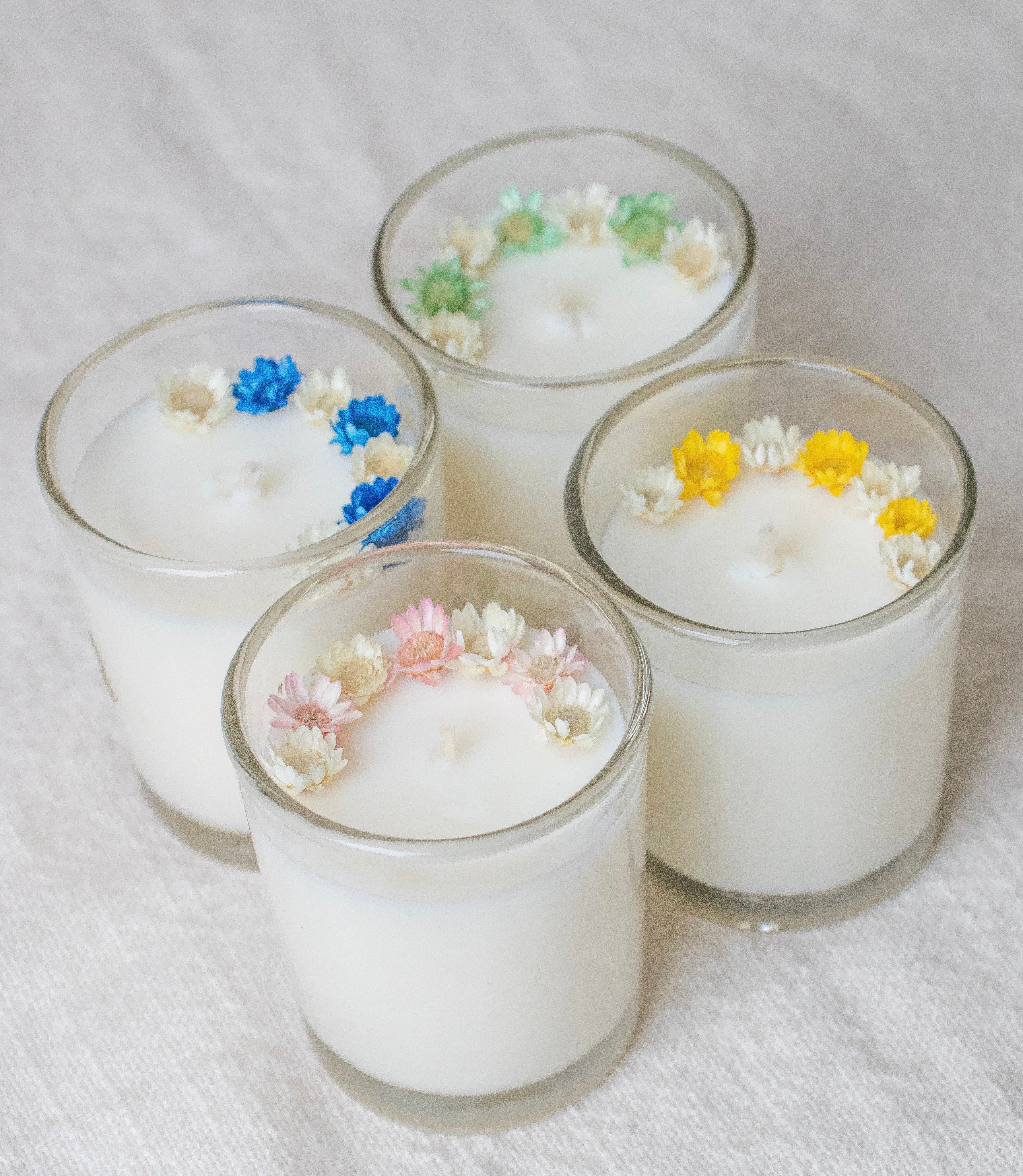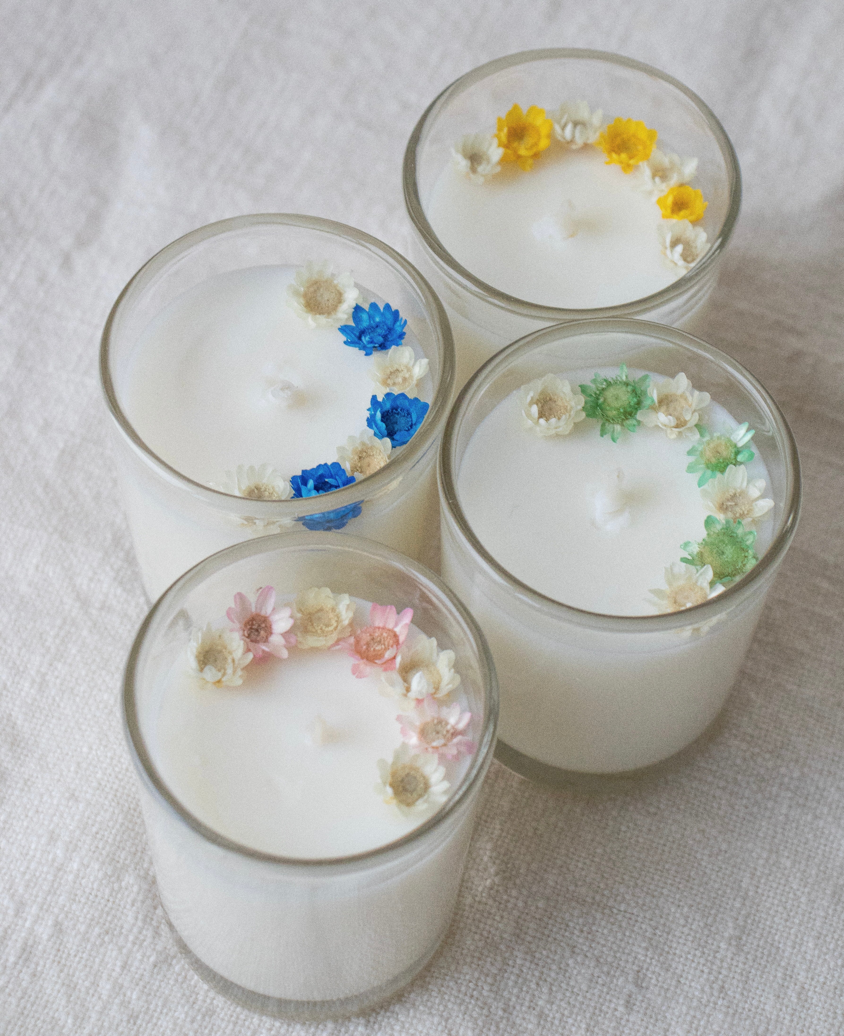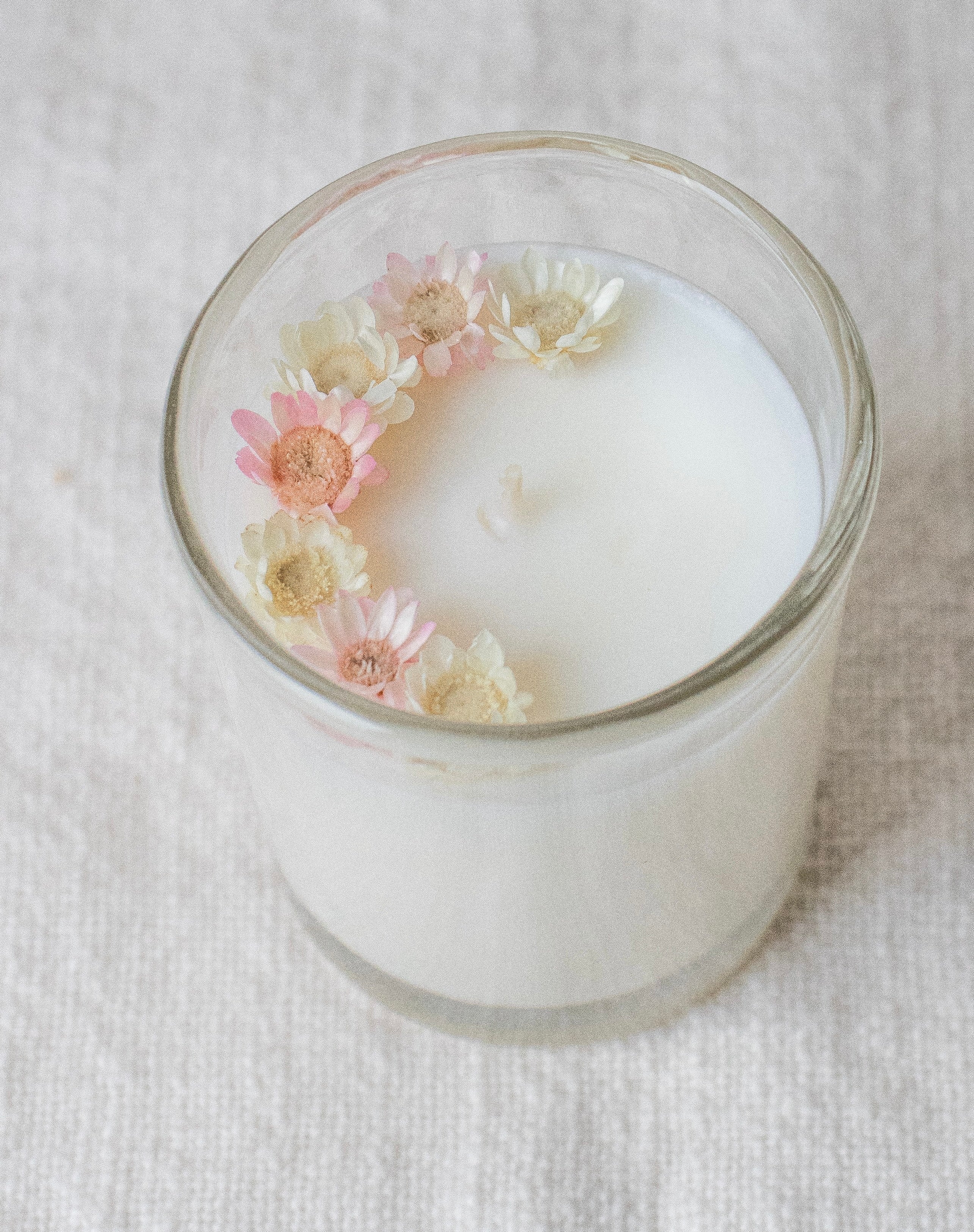 Handgemaakt mini kaarsje met droogbloemen. Een prachtige toevoeging aan de doopsuiker!