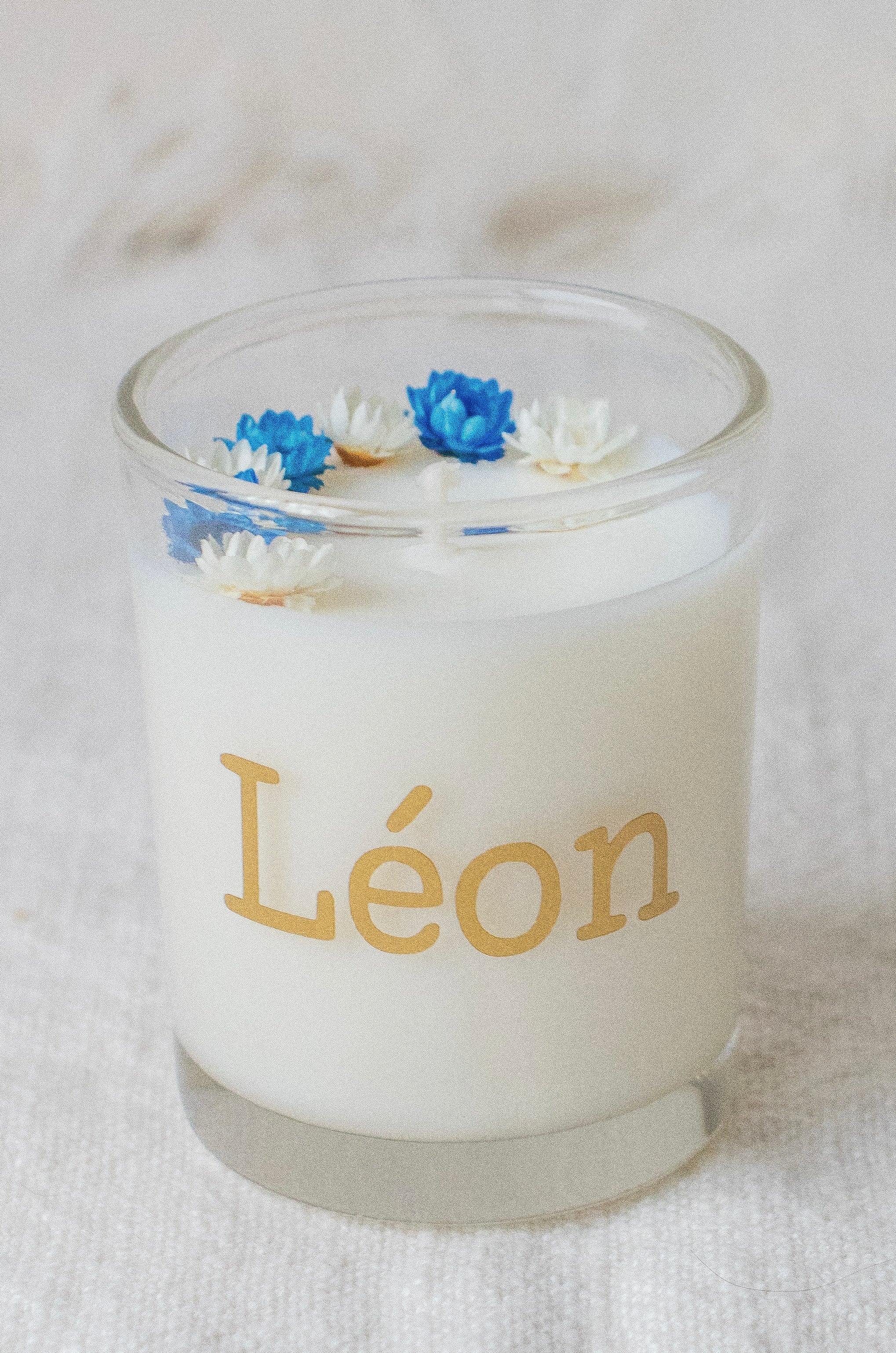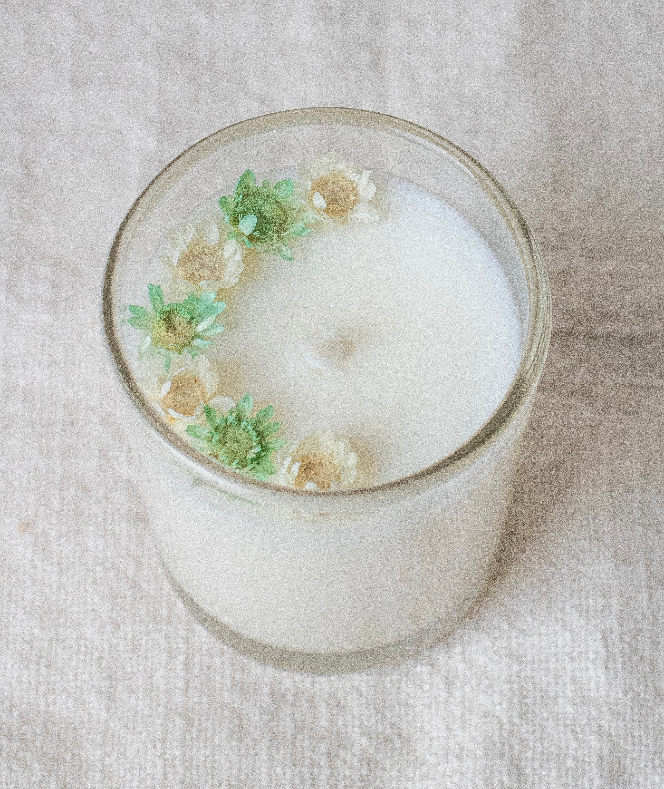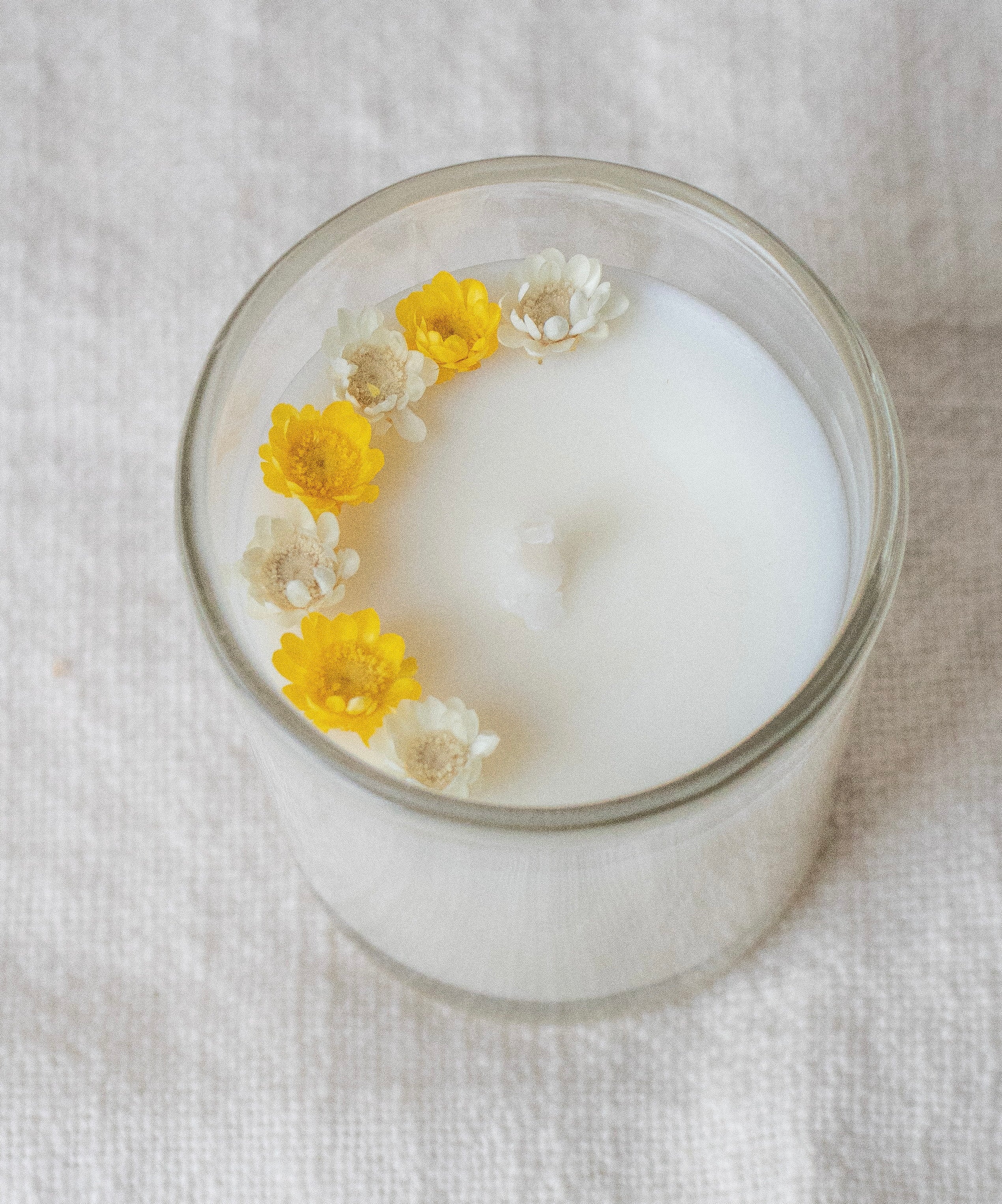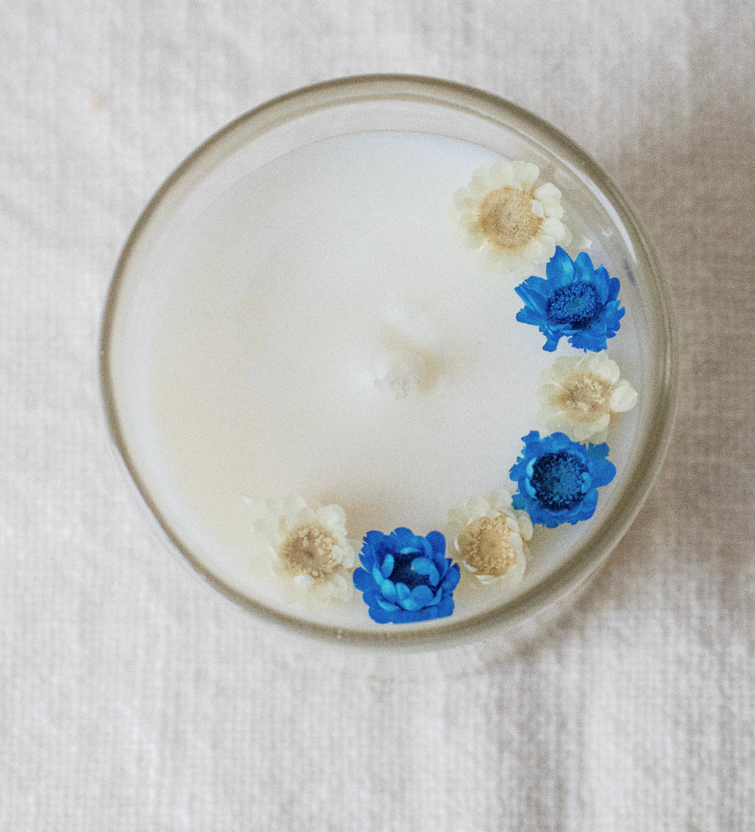 Handgemaakt mini kaarsje met droogbloemen. Een prachtige toevoeging aan de doopsuiker!