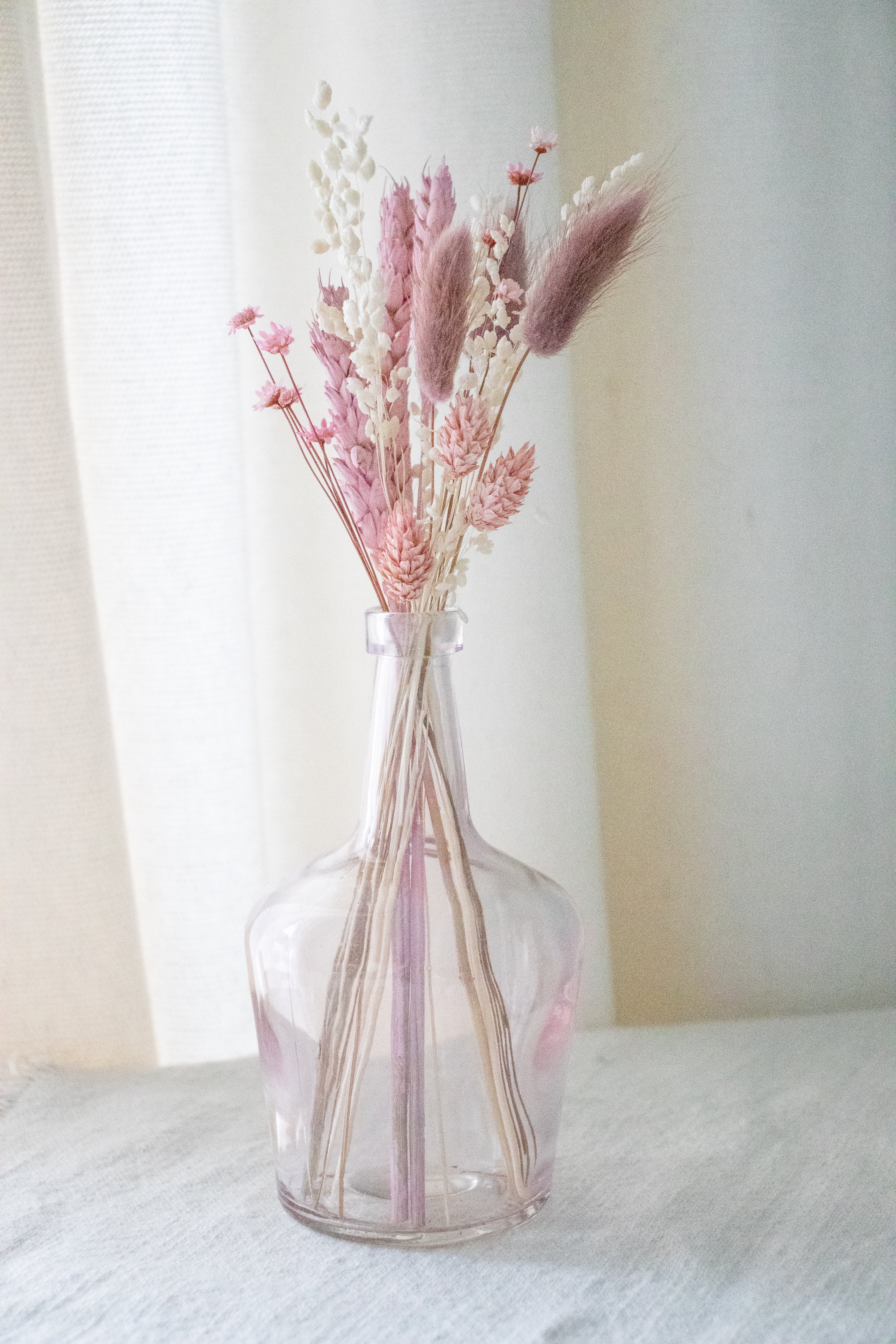 Een zacht roze boeketje dat precies uit een dromerig interieur lijkt te komen.