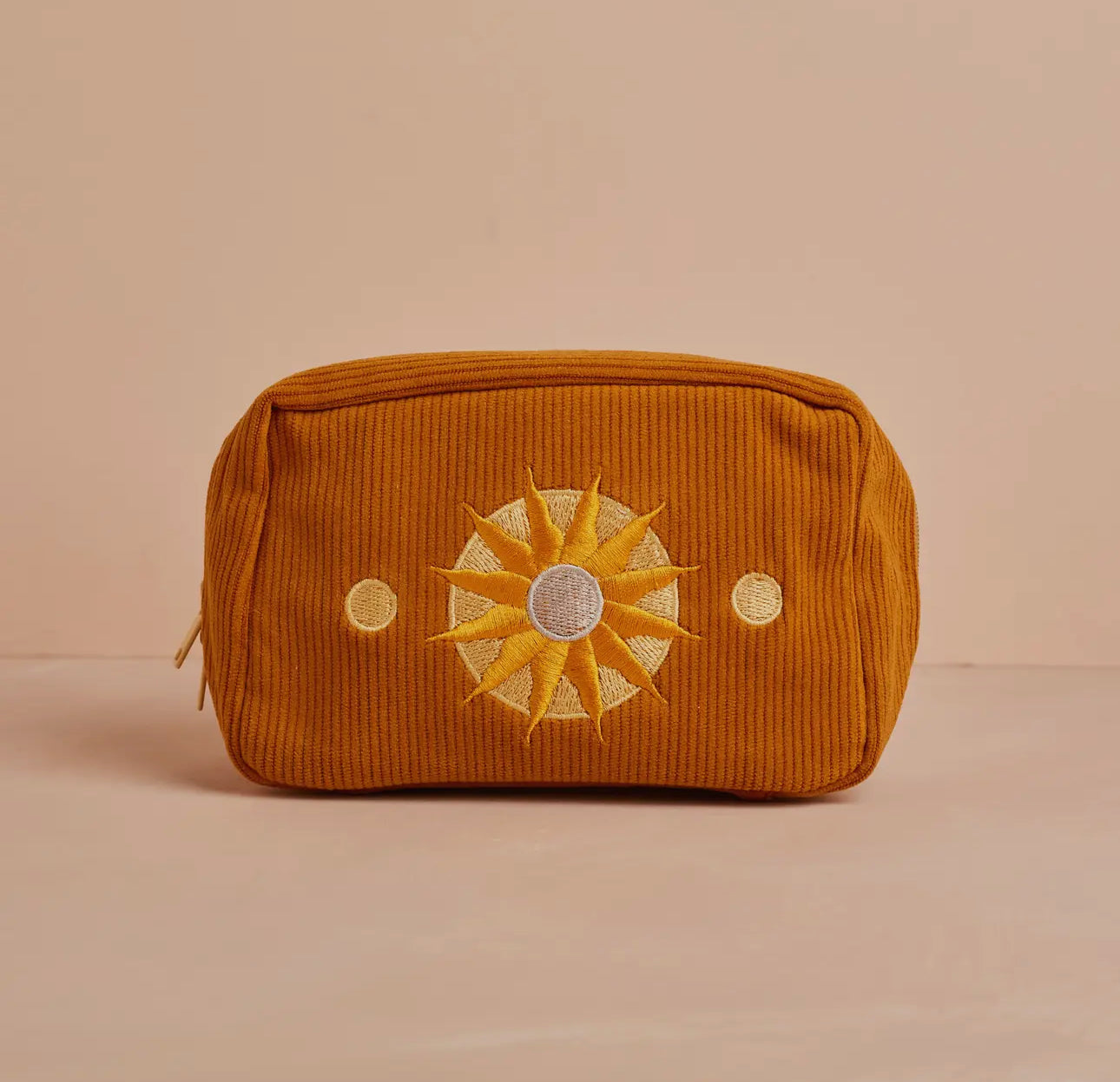 Met die geborduurde zon in het midden (en zโn mini planeten ernaast) is het net alsof je je eigen zonnestelsel in je handtas hebt. Perfect voor make-up, verzorgingsproducten of je geheime stash pleisters & lippenbalsems.