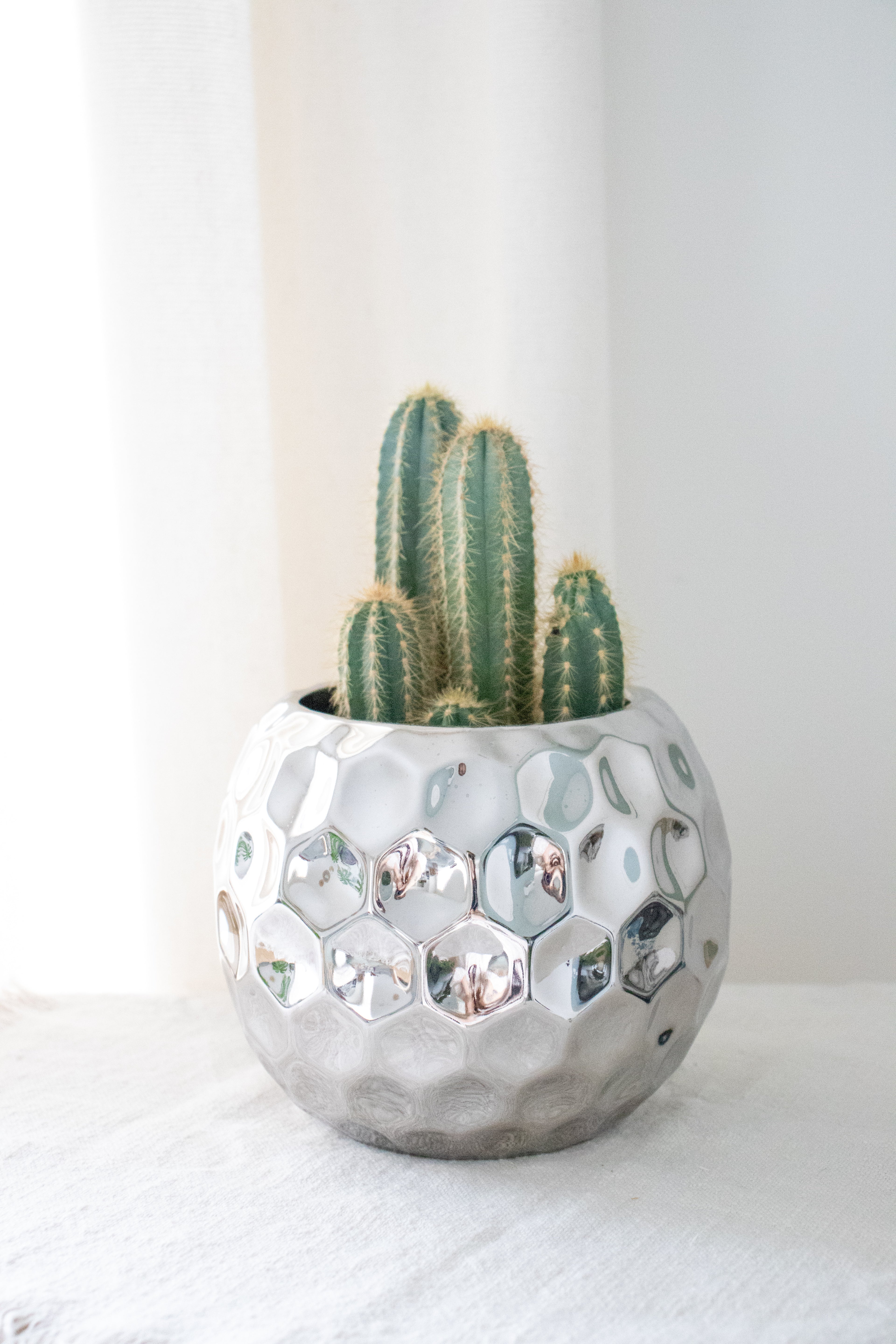 Deze zilverkleurige bolvaas met glanzende, facetachtige structuur geeft je ruimte meteen een moderne en chique touch.