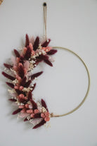Een subtiele blikvanger voor elk interieur.Deze handgemaakte krans is gevuld met droogbloemen in warme bordeaux- en oudroze tinten, afgewerkt met een gouden ring. Perfect om aan de muur te hangen of tegen een kast te zetten voor dat tikkeltje zachtheid in huis.