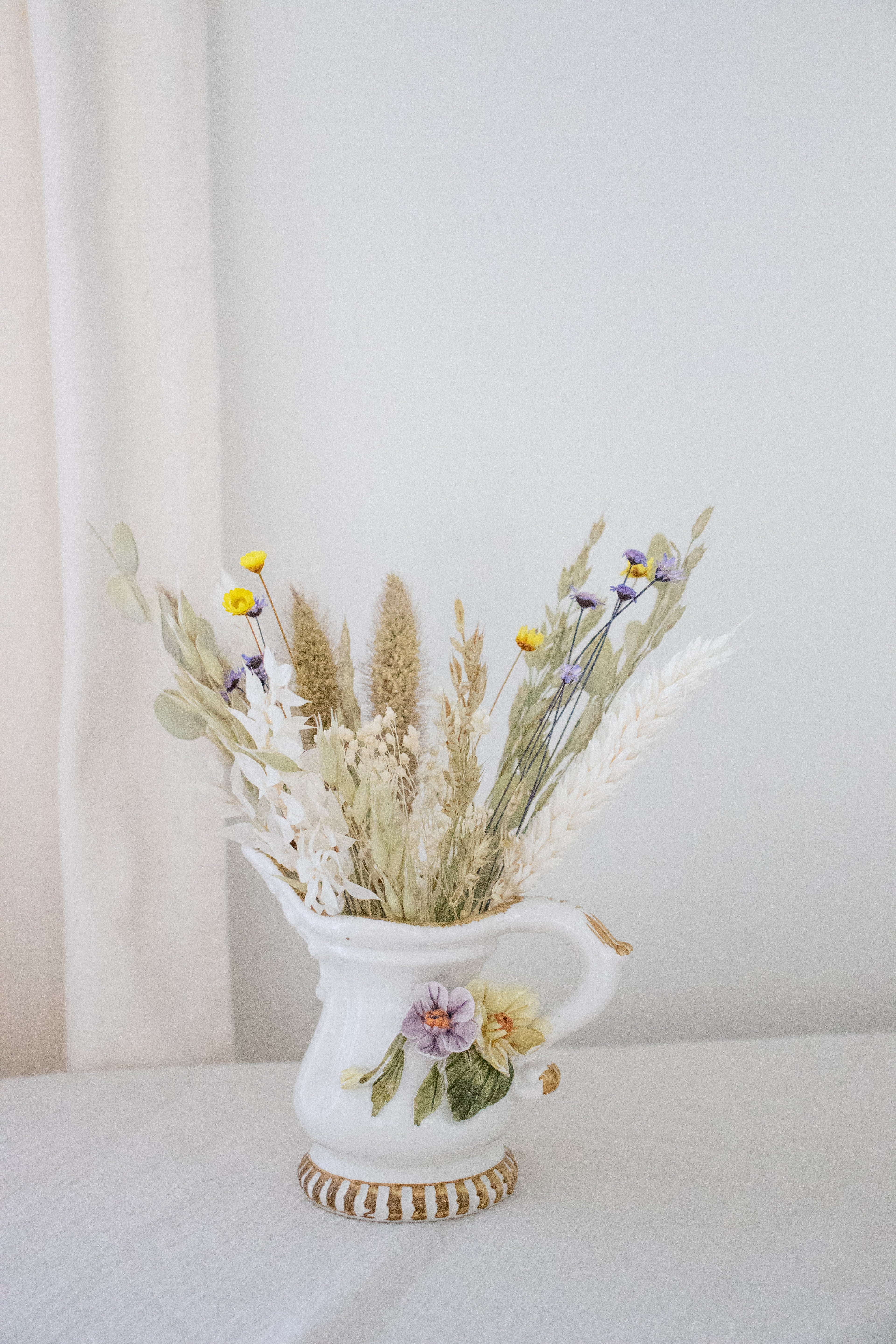 Dit unieke vaasje kreeg een tweede leven en straalt nu opnieuw met een tuiltje droogbloemen in zachte tinten. Ideaal voor wie houdt van een subtiel, romantisch accent in huis. Perfect op een dressoir of nachtkastje.
